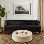 The Savile Sofa brings a fresh perspective to the iconic Chesterfield, blending timeless sophistication with modern appeal. Upholstered in luxurious faux leather, it features deep button tufting, refined nailhead trim, and a sturdy solid wood frame for enduring strength. Its transitional style makes it a versatile centerpiece, equally at home in classic interiors or sleek, contemporary spaces.