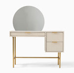 The Slate Fluted Dresser with Mirror is a stylish multitasker that blends bold design with daily convenience. Crafted from durable MDF, this piece showcases a stunning contrast between smooth lacquered surfaces and richly textured fluted wood drawer fronts, delivering both tactile charm and modern appeal. Its sleek round mirror (60 cm diameter) transforms the dresser into a versatile vanity or workspace, while multiple drawers offer ample room for organizing cosmetics, accessories, and essentials. Whether used in a bedroom or dressing area, Slate brings a perfect mix of functionality and elevated style to your routine.