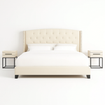 The Quila 3-Piece Bedroom Set combines timeless elegance with contemporary details. The centerpiece is a linen-upholstered platform bed featuring a wingback headboard adorned with button tufting and accented by pewter nailhead trim—a modern update to a classic silhouette. Built on a solid wood frame, it ensures both long-lasting durability and refined comfort.