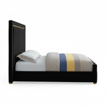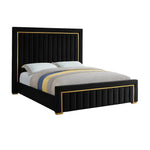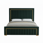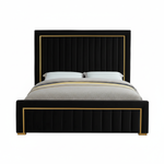 Luxury meets modern geometry in the Aurum Velvet Bed, a statement of refined elegance and architectural balance. With its bold black velvet upholstery and sleek gold detailing, Aurum brings a sense of grandeur and sophistication to any bedroom. The vertically channeled headboard and footboard exude depth and texture, while the metallic accents frame the silhouette with precision and grace. Designed with comfort and durability in mind, its solid wood structure ensures lasting strength making Aurum not just a bed, but a centerpiece of timeless style.