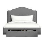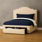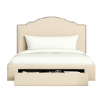 The Elaris Storage Bed combines refined detailing with functional design. Its curved, padded headboard is framed with hand-applied silver nailhead trim, bringing a touch of sophistication to any bedroom. Upholstered in soft linen fabric, Elaris complements both traditional and modern interiors. A single oversized footboard drawer provides generous storage for bedding, pillows, or seasonal items, keeping your space organized and clutter-free. Built on a robust solid wood frame with a durable wooden base, the Elaris delivers lasting comfort and support.