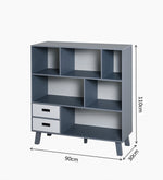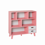 Shelf Configuration: Three open shelves for books, toys, and décor; two drawers for hidden storage