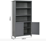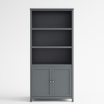 Structure: Tall vertical frame with a sturdy base; combination of open shelving and closed cabinet storage.