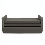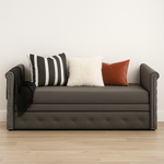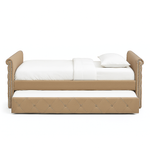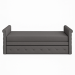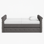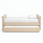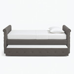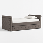 The Nestelle Trundle Daybed offers timeless elegance combined with practical functionality, making it an ideal addition for transforming any living room, guest space, or home office into a cozy retreat. Upholstered in soft polyester fabric, this piece features gently rolled arms, classic button tufting on both the arms and the trundle front, and refined nailhead trim that adds subtle charm and sophistication. The pull-out trundle provides effortless versatility, offering an additional sleeping surface whenever needed. Both the main and trundle beds come with medium-firm foam mattresses covered in matching fabric, ensuring a coordinated and comfortable experience for lounging or overnight guests.