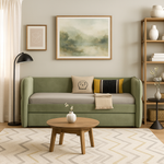 The Valenor Day Bed defines modern luxury and functional sophistication, offering a perfect blend of comfort, craftsmanship, and practicality. This elegant 1-piece daybed features a sleek pull-out trundle, allowing for effortless guest accommodation while maintaining a clean, contemporary profile. Upholstered in premium fabric and designed with refined proportions, the Valenor Day Bed brings both style and versatility to your space. Whether placed in a bedroom, lounge, or guest room, it offers relaxation by day and comfort by night, complete with two medium-firm foam mattresses with matching fabric covers. A seamless combination of modern design, functionality, and timeless elegance, the Valenor Day Bed is crafted to elevate every corner of your home exclusively by Lux Heaven.
