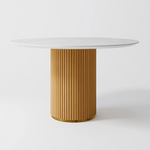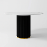 The Celeste Dining Table is a stunning centerpiece that blends elegance with practicality. Its round silhouette and clean, minimalist lines make it perfect for intimate meals or stylish entertaining. The tabletop features a high quality MDF surface with a marble look finish, offering the luxurious appearance of stone combined with the durability and easy maintenance of engineered wood. Supported by a fluted cylindrical base, this table adds texture and sculptural interest, creating a visually striking contrast with the smooth tabletop. Ideal for modern and contemporary interiors, Celeste comfortably seats 4 people, making it a sophisticated and practical choice for apartments, kitchens, or open plan spaces.