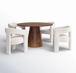 Minimal form. Maximum impact. The Drift 5-Piece Set pairs sculptural beauty with everyday function. The round table anchors the room with a tapered pedestal base and smooth MDF top, while four armchairs upholstered in soft fabric complete the look with quiet elegance. Perfect for design led interiors where simplicity speaks volumes.