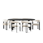 Built for gatherings, styled for today. The Osa Dining Set is a perfect centerpiece for your family meals or hosting friends. The large rectangular table offers generous surface space and is crafted from MDF wood with a sleek modern black finish. Each of the six chairs features a strong steel base and soft, textured upholstery with supportive curved backs great for long, relaxed dinners.