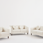 The Modeline Sofa Set combines refined elegance with everyday comfort, making it a standout addition to any living space. This 3-piece collection includes a sofa, loveseat, and armchair each upholstered in silky velvet for a luxurious feel. Built on a sturdy solid wood frame, the set offers lasting durability, while medium firm cushions provide balanced comfort and support. Modern channel tufting adds a sleek, stylish element, complemented by hand applied nailhead trim along the armrests for an elevated touch. With its clean silhouette and timeless detailing, the Modeline set transitions seamlessly between contemporary and classic interiors.