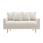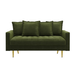 The Cimora Loveseat brings refined elegance and modern charm to any living space. Designed with a contemporary silhouette, this piece features clean square arms, sleek golden metal legs, and beautifully tufted cushions that add a touch of luxury. Its velvet upholstery delivers both comfort and sophistication, offering a soft, inviting feel perfect for everyday relaxation or stylish hosting. With its solid wood structure for durability and plush seating for comfort, Cimora is an ideal choice for apartments, living rooms, offices, or reception areas.