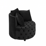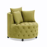 The Lunaris Accent Chair blends timeless elegance with everyday functionality. Wrapped in soft velvet with refined button tufting, it exudes charm and sophistication. Designed with smooth-rolling wheels for easy mobility and complemented by three accent pillows, it’s the perfect mix of comfort, style, and versatility for modern living.