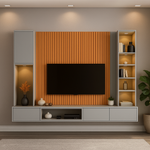The Axis Black TV Wall Unit redefines modern minimalism with its striking combination of sleek matte black cabinetry and warm wooden shelving. Designed to deliver both style and practicality, it offers ample hidden storage while maintaining a clean, contemporary aesthetic. Vertical wooden slats create a textured architectural backdrop, adding depth and visual interest. Integrated spotlights illuminate each open shelf, highlighting décor and enhancing the overall ambiance. The result is a bold yet inviting focal point that effortlessly elevates any living space.