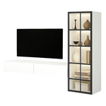 Rising above, the tall shelving tower with a glass door and integrated LED lighting creates a striking vertical display perfect for showcasing décor, books, or everyday essentials. Crafted from durable MDF with customizable matte or wood-accent finishes, the Vista balances style and practicality, making it a standout centerpiece in any contemporary living space.