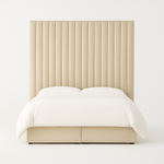 Structure: Extra-tall 300 cm W x 288 cm H upholstered headboard with vertical channel tufting, paired with a divan base on a solid wood frame.