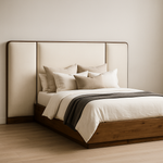 Visual Appeal: Winged headboard, soft linen texture, and tailored lines create a dramatic yet inviting focal point with timeless elegance.
