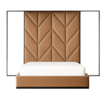 Structure: High 340 cm W x 288 cm H headboard with patterned panels and flanking mirrors, supported by a solid wood frame.