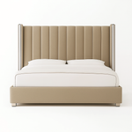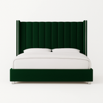 The Velouris Bed elevates any bedroom with its deep channel tufted velvet upholstery, creating a rich and luxurious feel. Its tall wingback headboard combines comfort and elegance, enhanced by sleek mirrored chrome metal strips for a contemporary edge. Supported by rectangular plated legs and a solid wood frame, Velouris delivers both style and durability, offering a perfect balance of sophistication and structural strength.