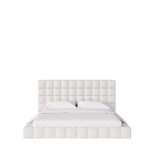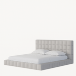 Structure: Asymmetric upholstered headboard with square tufting, supported by a solid wood platform base.