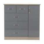 5 Drawer Compact Chest Compact Wardrobe has a modern design due to its pre-finished gloss which is completely different from the bright oaks. Nevada has your storage needs covered by five cabinets and a hanging space on a metal rail.