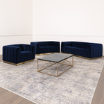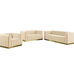 Bring a touch of modern glamour to your home with the Goldiva Sofa Set, designed to impress with both style and comfort. Upholstered in plush velvet and accented with elegant channel tufting, each piece sits atop a striking gold-finished wooden base that adds a bold, sophisticated statement. This 3-piece collection includes a spacious three seater sofa, a sleek loveseat, and a cozy armchair each crafted with a sturdy frame and supportive cushioning for everyday relaxation. Perfect for creating a chic, coordinated living space, the Goldiva Set combines comfort, durability, and standout design.
