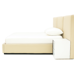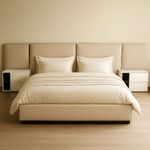 The Kaelis Panel Bedroom Set is the bright, clean bedroom upgrade you’ve been looking for. Featuring a low profile bed with an extended fabric headboard, it delivers a youthful yet sophisticated look. Oversized channel tufting adds bold visual interest, while the matching nightstands fit seamlessly into the extended headboard space, providing both function and contrast with their dark wood-look shelves. Paired with a supportive Bonnel spring mattress, the Kaelis Set balances texture, comfort, and contemporary design creating a bedroom that feels stylish, modern, and refreshingly unique.