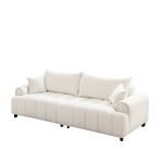 Elevate your living room with the Mirezo Sofa, a statement of modern sophistication and everyday comfort. Upholstered in soft bouclé fabric with refined stitch detailing, it combines plush texture with sculptural design. The curved silhouette and wide, tailored arms add an elegant, contemporary flair, while the fully upholstered back allows for flexible placement in any setting. Complete with two matching toss pillows, Mirezo offers both style and inviting coziness.
