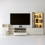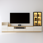 Configuration: Includes central TV cabinet, glass display cabinet, and chest of drawers