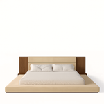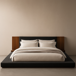 The Sakura Bed embodies minimalist elegance with its low slung Japanese platform design and sleek lacquered finish, creating a calming, grounded presence in the bedroom. A harmonious combination of natural wood and soft linen upholstery adds warmth and texture, balancing simplicity with comfort. Its clean lines and subtle detailing let the materials shine, inviting a sense of peace, stillness, and intentional living.