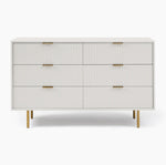 Crafted from high-quality MDF, the Slate Dresser brings dimensional detail and refined storage to contemporary interiors. Its signature feature—fluted wood drawer fronts—adds rich texture and visual depth, beautifully contrasted by a crisp lacquered frame and sleek metal pulls for a sophisticated finish. With six spacious drawers, it offers generous room to organize your essentials while enhancing your space with sculptural charm. Whether styled in a bedroom, hallway, or dressing area, the Slate Dresser is a perfect blend of statement design and practical storage.