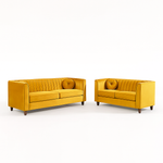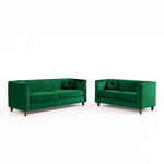 The Veltrix Sofa Set brings refined modern elegance to your living space with a complete 3-piece arrangement featuring one spacious 3-seater sofa and two matching loveseats. Upholstered in plush velvet for a luxurious feel, each piece showcases striking vertical channel tufting on the backrest, adding depth and texture to the sleek silhouette. Built on a solid wood frame with sturdy wooden legs, the Veltrix offers lasting durability and stable support. Two matching bolster pillows provide an elegant accent while enhancing comfort. Perfect for contemporary interiors, this set delivers both style and coziness in equal measure.